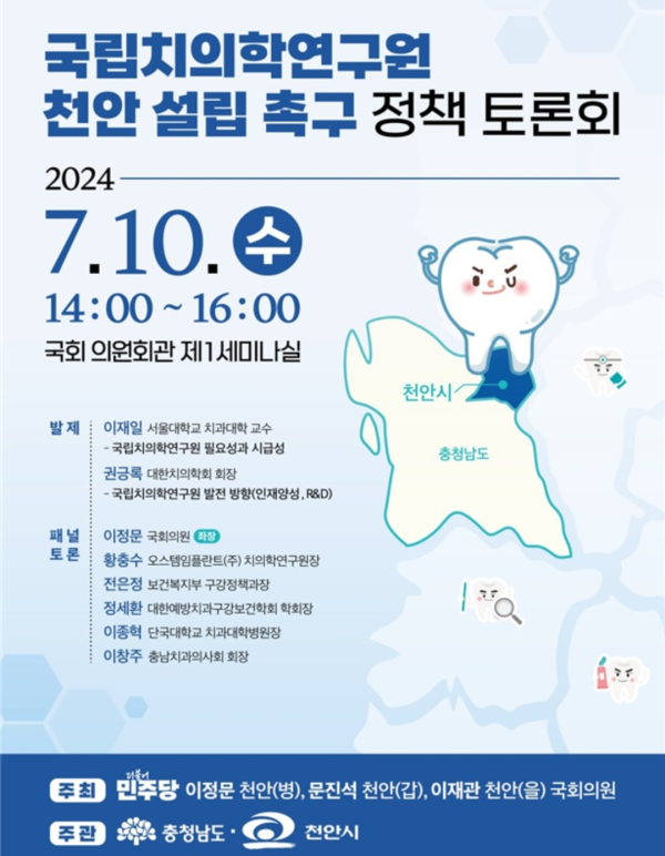 더불어민주당 문진석(천안갑)·이재관(천안을)·이정문(천안병) 의원은 오는 10일 국회 의원회관에서 ‘국립치의학연구원 천안 설립 촉구 정책 토론회’를 공동 주최한다.