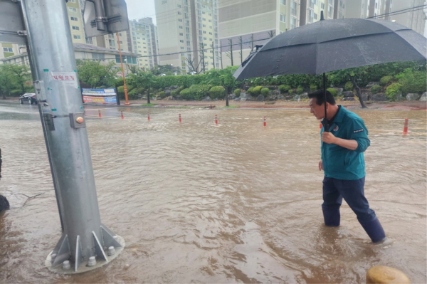 [충청뉴스 논산 = 조홍기 기자] 백성현 논산시장이 7일 밤부터 내린 폭우로 인해 피해가 발생한 지역을 돌며 더욱 세심한 안전관리와 철저한 대책 마련을 지시했다.