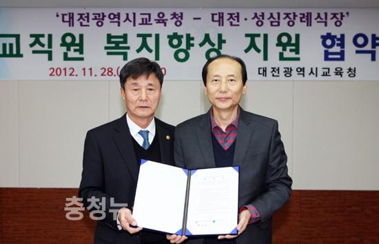 대전광역시교육청(교육감 김신호)은 28일 대전·성심장례식장과 교직원 복지향상 차원에서 장례식 비용절감을 위한 협약을 체결했다고 밝혔다.