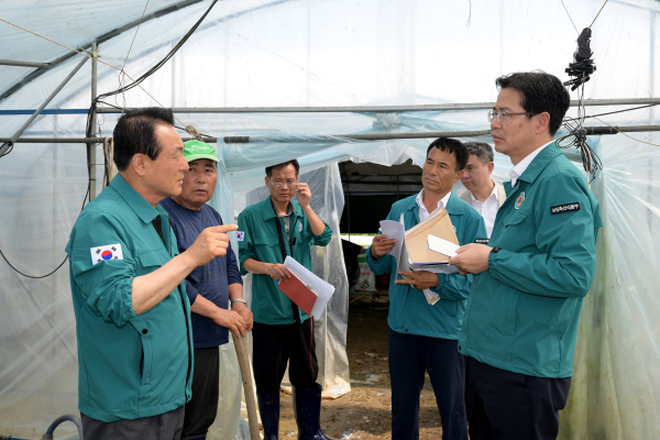 관내 수해 피해 현황을 파악하기 위해 현장을 방문한 강형섭 기획조정실장은 관내 수박 하우스 농가주를 만나고 피해 규모 및 필요한 지원 절차 등을 확인했다.