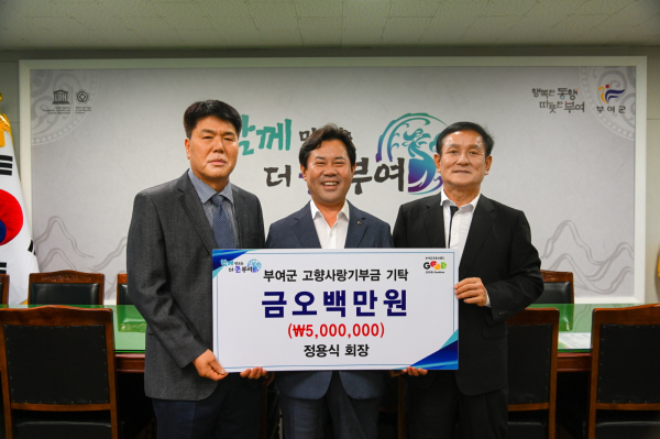 [충청뉴스 조홍기 기자] 부여군 부여읍 가탑리가 고향인 ㈜엔케이시스템 정용식 회장이 지난 9일 고향사랑기부금 개인 최고액인 500만 원을 부여군에 기부했다. 또한 정용식 회장이 기부액의 30%로 받는 답례품 150만 원 상당을 굿뜨래페이로 수령해 굿뜨래장학회에 재기부하겠다고 전했다.