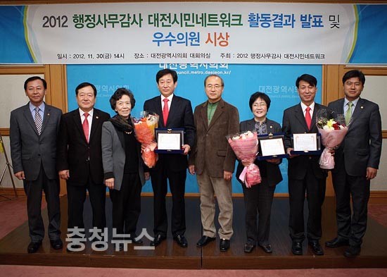 대전광역시의회(의장 곽영교) 행정자치위원회 김명경 의원, 복지환경위원회 박정현 의원, 산업건설위원회 김경훈 의원은 11월30일 ‘2012행정사무감사 대전시민네트워크’로부터 행정사무감사 우수의원상을 수상했다.