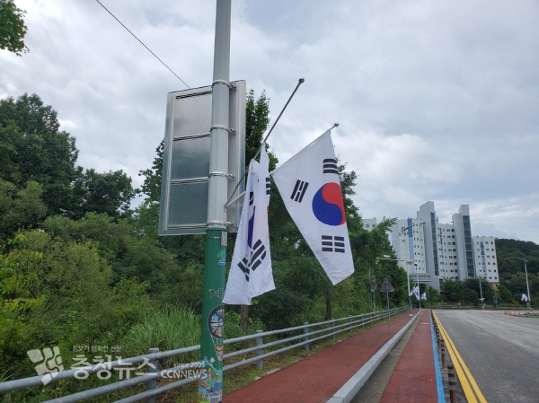 [충청뉴스 계룡 = 조홍기 기자] 충남 계룡시 도로에 내걸린 태극기가 훼손된 채 방치되고 있어 눈총을 사고 있다.