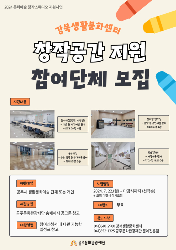 <2024 문화예술 창작스튜디오 지원사업>은 공주시에 근거를 두고 문화예술 활동을 하는 성인 단체 또는 개인을 대상으로 강북생활문화센터 동아리실, 온누리실, 신바람밴드실 공간을 지원한다. 미술, 음악, 무용, 연극 등 다양한 문화예술 장르를 자유롭게 연습하고 활용하는 공간으로 사용할 수 있으며, 운영시간은 매주 화~금 12:00~21:00, 토요일 9:00~18:00까지 운영된다.