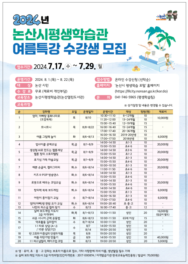 [충청뉴스 논산 = 조홍기 기자] 논산시(시장 백성현)가 오는 28일까지 ‘2024년 논산시 평생학습관 여름특강’ 수강생을 선착순 모집한다.