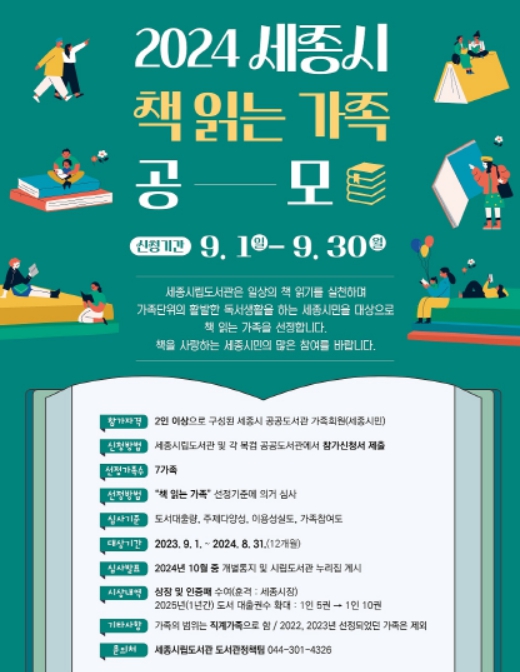 단, 세종시 공공도서관 회원 중 2인 이상 가족으로 등록돼 있어야 하며 2022년과 2023년에 선정됐던 가족은 제외된다.