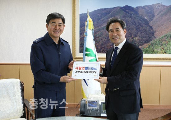 계룡대근무지원단(단장 정영진)은 지난달 26일 계룡시를 방문해 취임식에 축화용 화환대신 받은 쌀 150kg 계룡시(시장 이기원)에 어려운 이웃에 써달라며 기탁해 왔다.