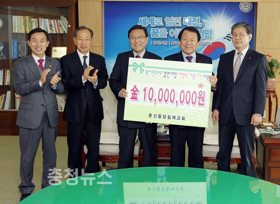 대전둔산중앙침례교회(목사 박문수)는 6일 오전 대전시청을 방문해 복지만두레 결연가구의 따뜻한 겨울나기에 써달라며 난방유 지원금 1천만 원을 기탁했다.