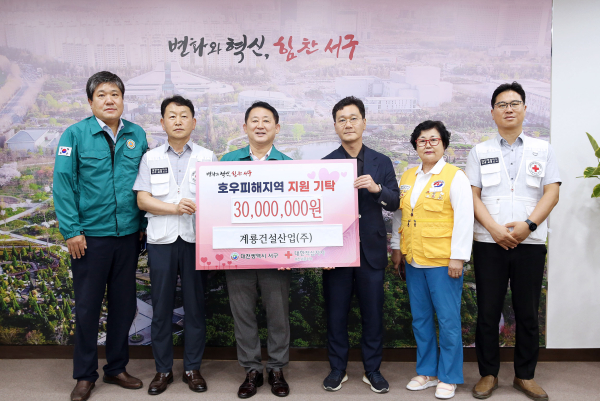 서철모 청장은 “우리 지역을 위해 소중한 기탁을 해주심에 감사드리며, 서구도 피해 지역 곳곳의 복구에 최선을 다하겠다”라며 “계룡건설산업(주)도 더욱 크게 발전하고 번창해 지역사회와 함께하는 일류기업이 되어 달라”고 말했다.