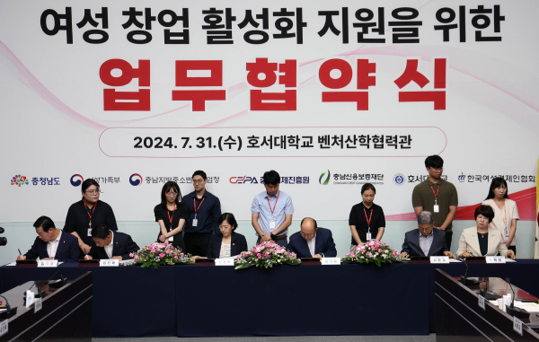 도는 31일 호서대 아산캠퍼스에서 여성가족부와 창업 지원 기관 5곳(충남경제진흥원, 충남신용보증재단, 충남지방중소벤처기업청, 한국여성경제인협회, 호서대)과 ‘여성 창업 지원 활성화를 위한 업무협약’을 체결했다.