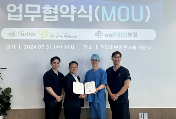 [충청뉴스 최형순 기자] 31일 사단법인 청소년만세(이사장 정덕진)에서 위탁 운영하고 있는 천안청소년자립지원관(관장 김상백)은 위라이브병원(대표원장 유재성,황창환)과 자립준비 청소년의 건강증진과 의료지원을 위해 업무협약을 체결했다.