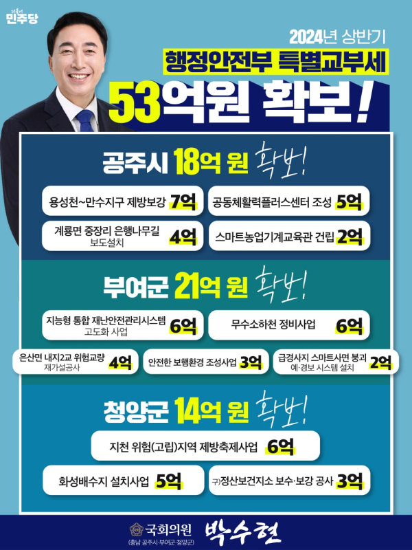 박수현 의원은 31일 충남 공주·부여·청양에 올해 상반기 행정안전부 특별교부세 12개 사업에 53억원을 확보했다고 밝혔다.