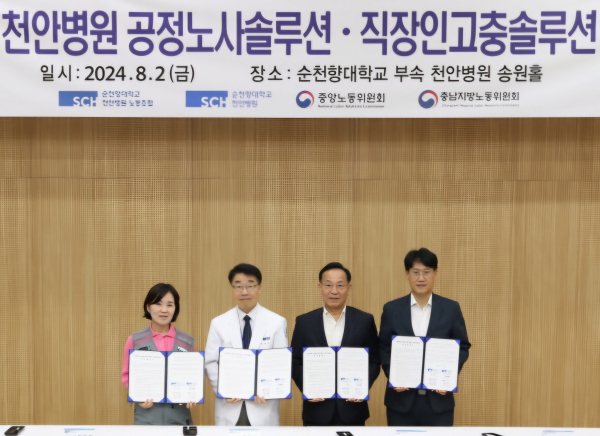순천향대 천안병원과 노동조합은 최근 병원 강당에서 중앙노동위원회, 충남지방노동위원회와 업무협약을 맺었다고 5일 밝혔다.