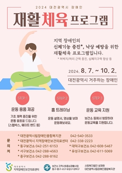 이번 비대면 장애인 재활체육 프로그램은 대전광역시 5개구 보건소 지역사회중심재활사업팀, 대전광역시립장애인종합복지관과 협력하여 지역 장애인 30명을 대상으로 진행한다.