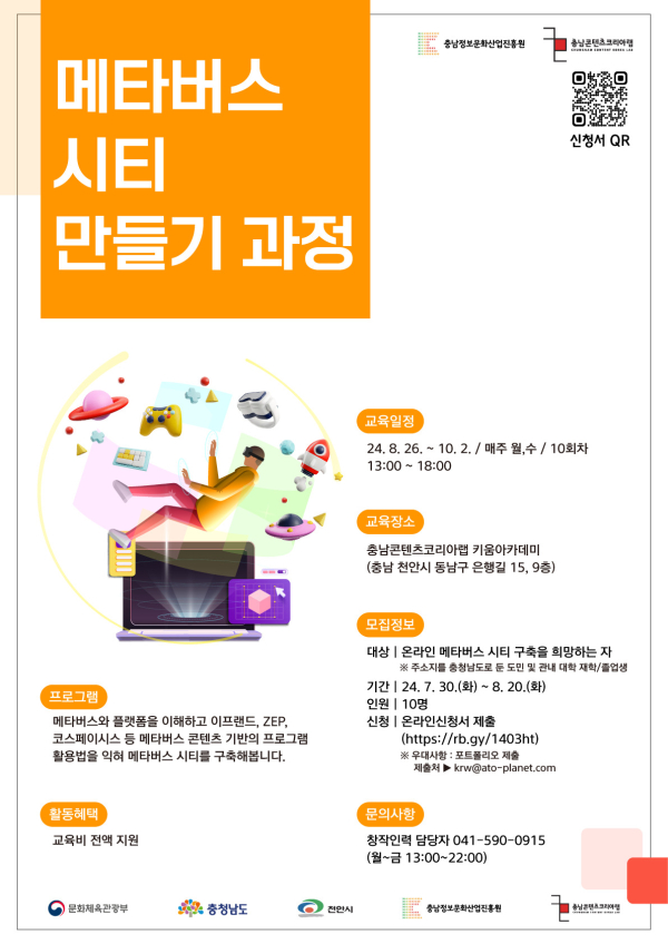 교육은 진흥원 내 충남콘텐츠코리아랩에서 진행하며, 교육 참여 희망자는 각 교육 포스터에 있는 QR코드를 통해 신청하면 된다.