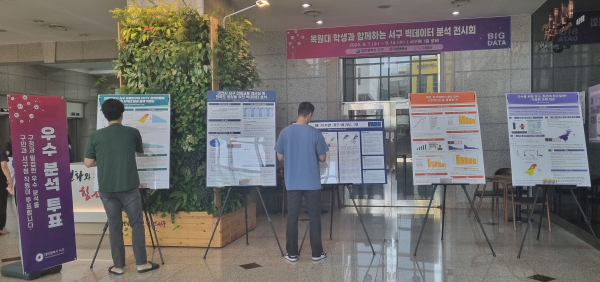 이번 전시회는 목원대학교 마케팅빅데이터학과 학생들의 ‘빅데이터 캡스톤 디자인’ 수업과 연계해 올해 3월부터 서구 지역 현안 과제를 스스로 발굴, 분석하는 실무 능력 향상과 각종 현안을 함께 해결하고자 마련됐다.