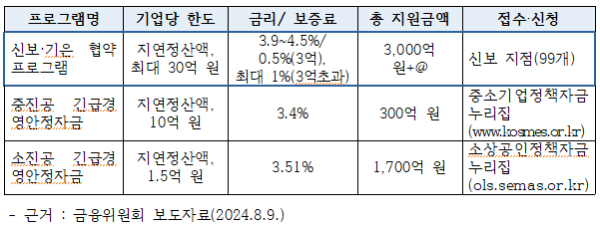 먼저, 신용보증기금과 기업은행 협약프로그램은 지연정산액 기준 기업당 최대 30억 원까지 3.9-4.5% 금리로 지원한다.