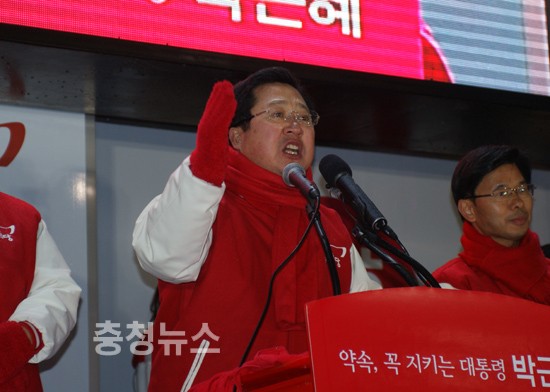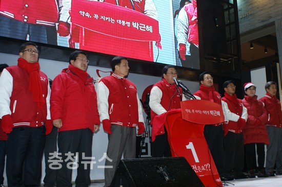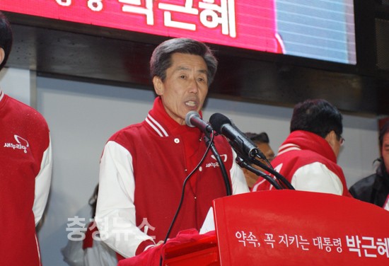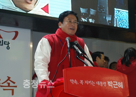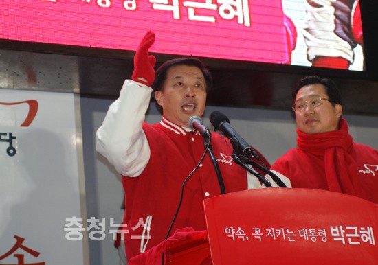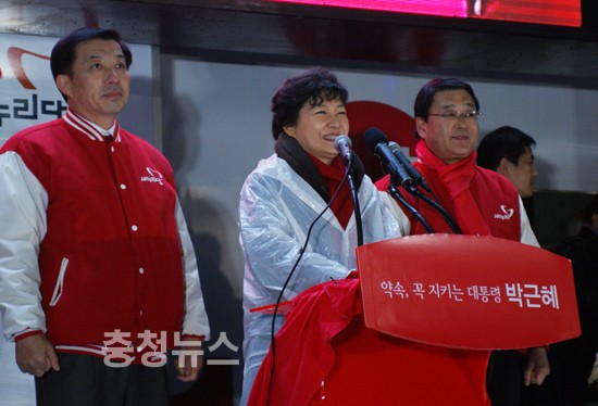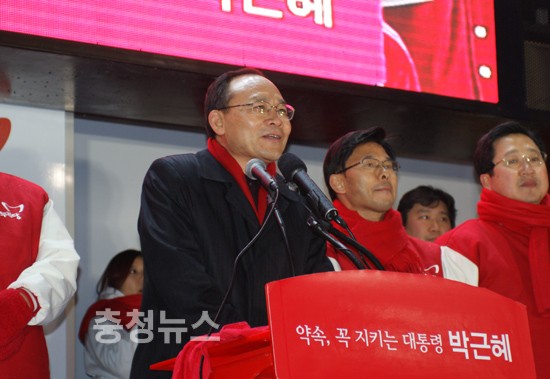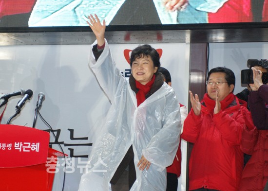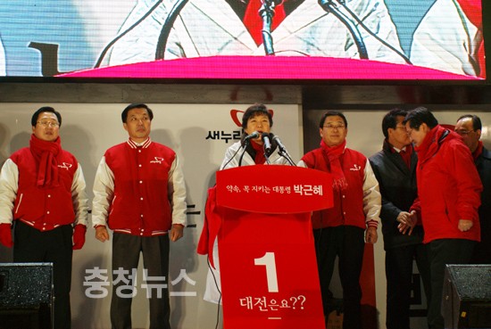 새누리당 박근혜 대통령 후보는 선거운동 첫 날 시작을 대전에서 한데 이어 선거를 닷새 앞둔 14일 대전을 방문해 "우리나라가 미래로 나가느냐 아니면 분열과 갈등의 실패한 과거로 돌아가느냐 하는 것이 대한민국의 중심 대전 충청에 달려있다"면서 지지를 호소했다.
