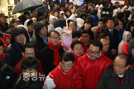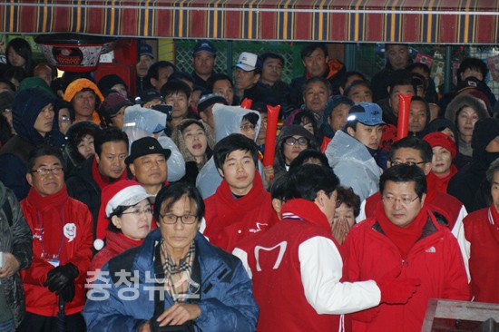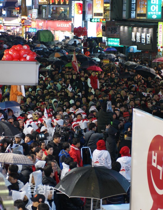 이날 박 후보가 대전 유세를 가진 중구 은행동 으능정이 거리는 박 후보를 지지하는 5000여 명의 인파가 몰리며 발 디딜틈도 없는 모습을 보였다. 이들 대전지역 박 후보 지지자들은 비가 내리는 궂은 날씨에도 불구하고 연신 "박근혜"를 연호하며 대전지역의 뜨거운 박 후보 지지를 실감케 했다.