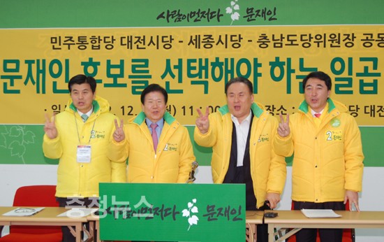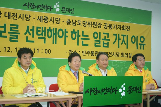 민주통합당 대전·세종·충남 위원장들은 17일 오전 민주통합당 대전시당 공동 기자회견에서 문재인 후보를 선택해야 하는 7가지 이유를 제시하며 정책호소를 했다.
