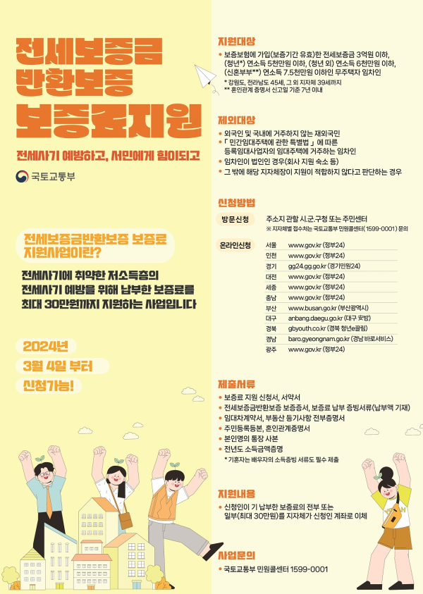 시 관계자는 “전세금 미반환으로 인한 피해를 예방해 서민층 주거 안정에 도움이 될 수 있도록 최선을 다하겠다”고 밝혔다.