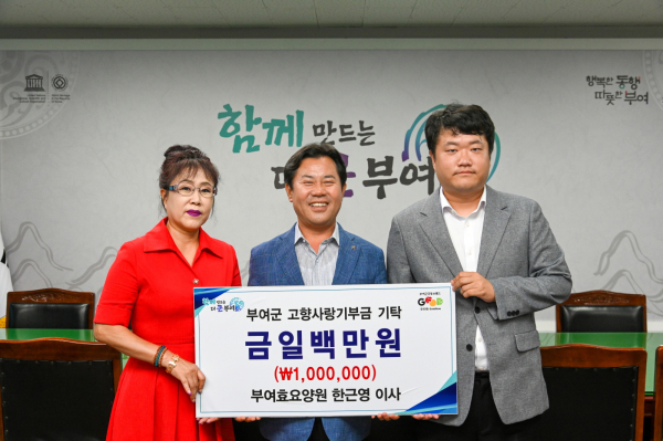 [충청뉴스 부여 = 조홍기 기자] 부여군(군수 박정현)은 지난 14일 부여효(孝)요양원(대표 이순자) 한근영 이사가 고향사랑기부금 100만 원을 기탁했다고 밝혔다.