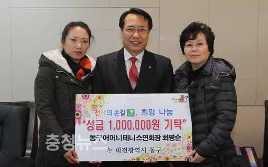 18일 어려운 이웃 위한 성금 백만원 기탁 ▲ 동구어머니테니스연합회, 천사의 손길 성금 기탁 대전광역시 동구어머니테니스연합회(회장 최평순)는 18일 한현택 동구청장을 찾아 천사의손길 행복플러스(+) 운동에 어려운 이웃을 위한 성금 백만원을 기탁했다. 최평순 회장은 “작지만 아름다운 사랑을 전하는 천사의 손길 운동 취지에 동감해 성금을 기탁하게 됐다”며 “어려운 이웃을 위한 소액기부문화 확산을 위해 노력하겠다”고 말했다. 저작권자 © 충청뉴스 무단전재 및 재배포 금지 문요나 기자 다른기사 보기 기사가 마음에 드셨나요? 충청뉴스 좋은 기사 후원하기 1,000원 3,000원 5,000원 10,000원 30,000원 50,000원 직접입력 비회원 약관동의하기 ※ 소중한 후원금은 더 좋은 기사를 만드는데 쓰겠습니다.