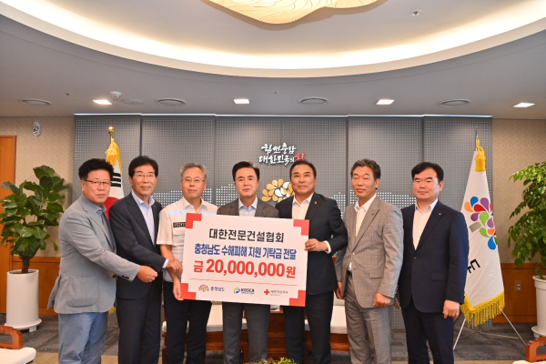 김태흠 지사와 윤학수 대한전문건설협회 중앙회장, 박종회 세종시·충청남도회장 등이 참석한 가운데, 이번 자리는 간담회, 성금 기탁 순으로 진행했다.
