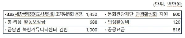 그 외, 통‧리장 수당 인상분(30만→40만)을 고려, 통‧리장 활동보상금 7억 원을 추가하고, 의정활동비 1억 2천만원을 반영하였으며,청사 공공요금 부족분 8억 원, 금남면 복합커뮤니티센터 건립에 10억 원도 이번 추경안에 담았다.