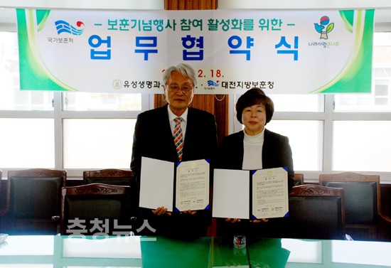 자라나는 학생들에 대한 보훈기념행사 참여 활성화를 위한 대전지방보훈청(청장 신영교)과 유성생명과학고등학교(교장 정충호)간 상호협력 MOU 체결이 18일 오후에 유성생명과학고등학교 교장실에서 실시됐다.