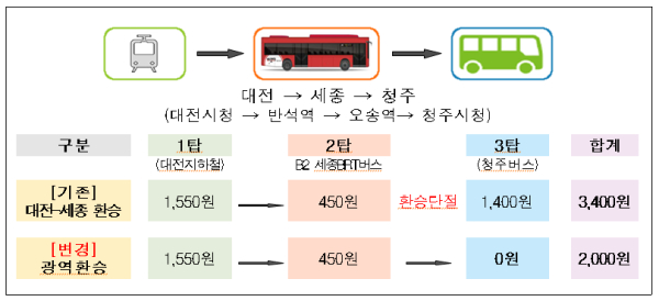 이에 따라 8월 26일부터는 기존 대전과 세종 간에 적용되던 대중교통 환승할인을 청주와 공주까지 확대하여 받을 수 있게 된다. 그동안 세종이나 대전에서 청주, 공주로 이동하려면 교통비를 추가로 부담하였으나 앞으로는 BRT(간선급행버스체계), 시내버스, 도시철도 등을 이용할 경우 기본요금만 내면 3회까지 무료로 환승할 수 있다.