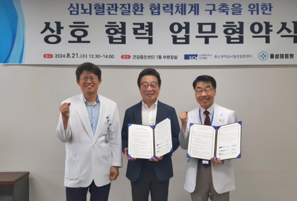 순천향대 천안병원 충남권역심뇌혈관질환센터가 21일 홍성의료원과 업무협약을 체결했다. (왼쪽부터)윤석만 충남권역심뇌혈관질환센터장, 김건식 홍성의료원장, 박형국 순천향대 천안병원장./순천향대 천안병원 제공