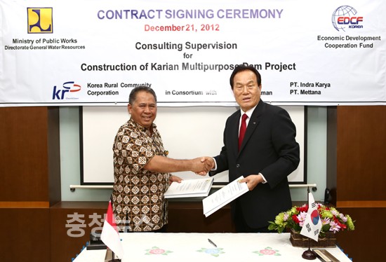 박재순 사장과 모하마드 하산 수자원청장은 21일(현지시각 10:30) 자카르타에 위치한 인니 공공사업부에서 총 공사비 2억 5천만 달러 중 6백9십만 달러의 공사감리 계약에 서명했다.