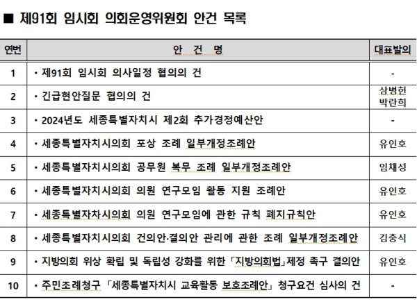 의회운영위원회는 내일 26일부터 9월 9일까지의 임시회 기간 중, 의회사무처 소관 '2024년도 행정사무감사 지적사항에 대한 조치 결과'를 청취하고, '2024년도 제2회 추가경정예산안'을 심사하며, 또한, 조례안 4건과 결의안 1건 등 총 10건을 처리할 예정이다.