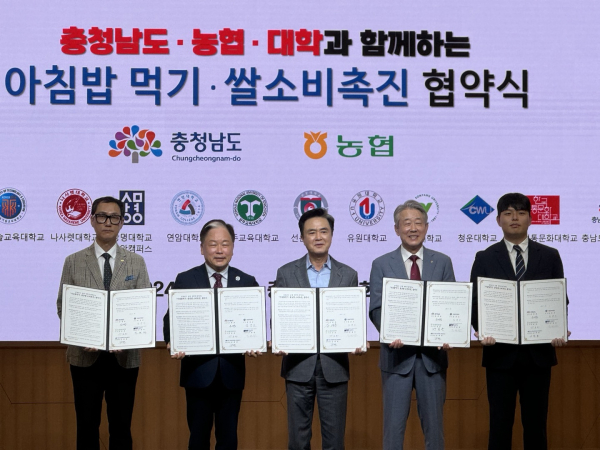 김태흠 충남지사는 26일 도청 대회의실에서 임경호 공주대 총장, 강호동 농협중앙회 회장, 조횬반 순천향대 학생처장 등과 ‘아침밥 먹기·충남 쌀 소비 촉진’협약을 체결했다.