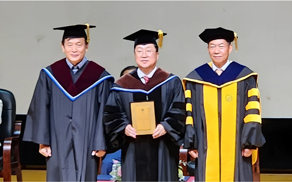이날 배재대 콘서트홀에서 열린 ‘명예 박사 학위수여식’엔 조보현 학교법인 배재학당 이사장, 김욱 배재대 총장을 비롯해 법인 이사, 교직원 등 300여명이 참석해 학위 수여를 축하했다.