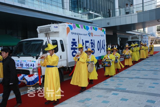내포신도시 시대 개막을 알리고, 충남의 밝은 미래를 기원하기 위해 마련한 이날 행사는 ▲이사 환영 퍼레이드와 ▲신청사 입주 이벤트 ▲전례행사 등 3부로 나눠 진행됐다.