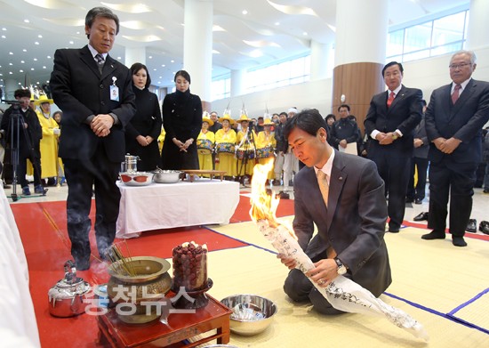 ‘도정의 밝은 미래 기원제’로 명명한 전례행사는 천안흥타령풍물단의 3도 사물놀이에 이어 안희정 지사의 초헌례, 기원문 낭독, 김기영 부의장의 아헌례, 도교육감·충남경찰청장·홍성군수·예산군수의 종헌례 등의 순으로 진행, 충남의 발전과 번영을 기원했다.