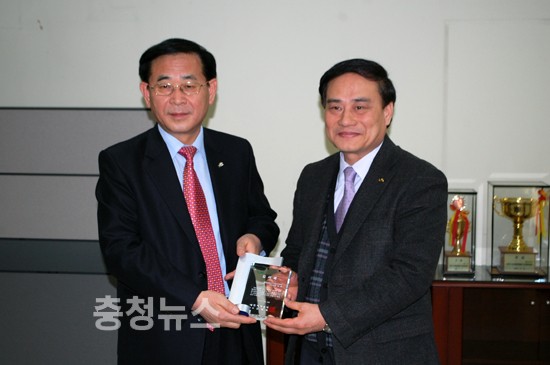 ▲ 김태웅(왼쪽)한국농어촌공사 충남지역본부장이 27일 오후3시 대한지적공사 김재학(오른쪽)대전.충남본부장으로부터 김영호 대한지적공사 사장의 감사패를 받은 뒤 기념촬영하고 있다