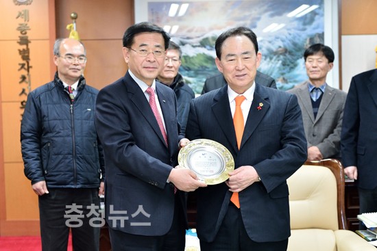 세종특별자치시의회 유환준 의장은 26일 의장실에서 한국농어촌공사 김태웅 충남지역본부장으로부터 원활한 농업용수 공급을 위한 수리시설 개발사업에 남다른 열정과 적극적인 지원으로 살기좋은 농어촌 건설에 기여한 공로로 박재순 한국농어촌공사 사장의 감사패를 전달 받았다.