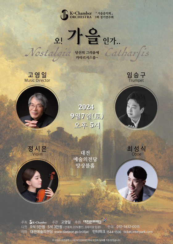 매 연주 친숙한 프로그램에 참신한 기획과 새로운 해석을 선보이는 케이챔버오케스트라가 트럼펫과 오보에, 바이올린의 협연으로 애틋한 가을의 시를 전하려 한다. 이번 공연은 지휘자 고영일의 깊이있는 해설과 진행으로 바이올린 정시은, 오보에 최성식, 트럼펫 임승구가 함께 한다.