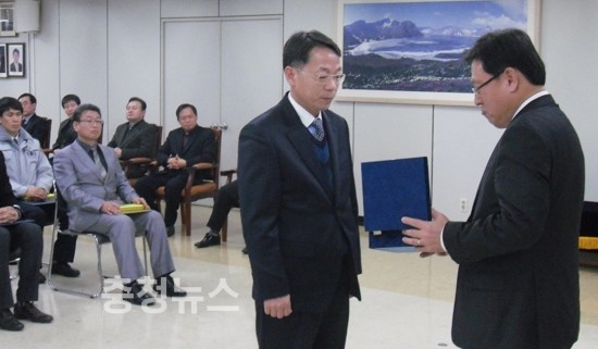 ▲ 지난 28일 오후 3시 대전지방검찰청 중회의실에서 열린 시상식에서 세종시 권영윤 감사관이 대전지방검찰청 조성욱 검사장에게 기관표창장을 받는 모습.