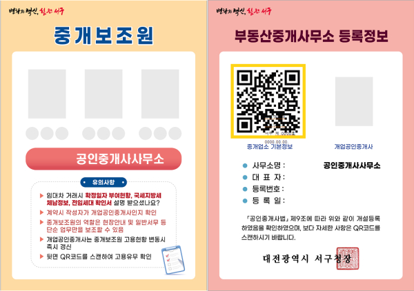 [충청뉴스 박영환 기자] 대전 서구가 투명한 부동산 거래 문화 조성과 중개보조원의 불법 중개행위 예방을 위해 중개보조원 신분증을 제작·배부 할 예정이다.