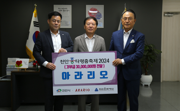 [충청뉴스 박동혁 기자] 충남 천안 향토기업 ㈜아라리오가 ‘천안흥타령춤축제 2024’의 성공을 기원하며 천안문화재단에 발전 기금 3000만 원을 기탁했다.