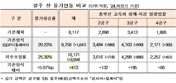 이에 따라, 이달 말 발주 예정인『충북선 고속화 제2,3,4공구(T/K)』의 발주금액을 기본계획 대비 25.3% 인상하여 1조 171억원(2공구 3,616억원, 3공구 4,298억원, 4공구 2,257억원)으로 책정했으며 이는 충분한 사업성을 보장하여 건설사의 관심도가 증대될 것으로 기대된다.