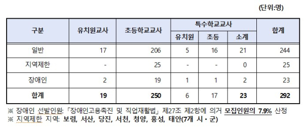 도교육청은 임용후보자 선정경쟁시험을 통해 유치원 교사 19명, 초등교사 250명, 특수학교 교사 23명 등 총 292명의 신규교사를 선발할 예정이다.