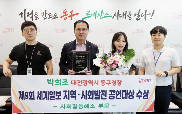 박 청장은 ‘진심’과 ‘소통’을 바탕으로 민선 8기 출범부터 영유아 부모‧청소년‧학부모‧청년서포터즈 등 다양한 계층의 주민들을 만나 현장의 목소리를 듣고 이를 정책에 반영하는 등 지역사회 통합을 위해 노력한 결과, 상생과 화합의 동구를 선도하는 공로를 인정받아 ‘사회갈등해소’ 개인부문 대상 수상자로 선정됐다.
