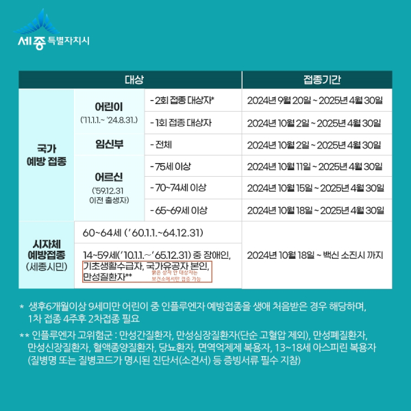 이번 예방접종은 안전한 예방접종을 위해 대상자별로 순차적으로 시행된다. 무료 접종 대상은 생후 6개월에서 13세 이하 어린이, 임신부, 65세 이상 어르신, 세종에 주소지를 두고 있는 60~64세, 기초생활수급자, 장애인, 국가유공자, 만성질환자다.