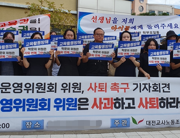 [충청뉴스 이성현 기자] 대전교사노동조합이 19일 대전 중구 한 초등학교 정문 앞에서 "교권침해를 한 학교운영위원회 위원은 사과와 자진 사퇴하라"고 촉구했다.