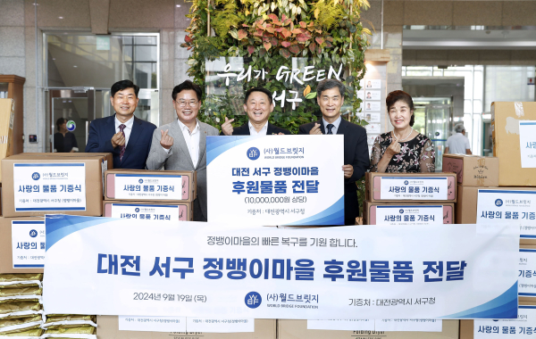 기탁식은 지난 7월 수해로 큰 피해를 본 기성동 정뱅이마을 주민들을 지원하고자 마련됐으며, 서철모 서구청장을 비롯해 (사)월드브릿지 임원진과 지역 시의원, 구의원 등이 참석했다.
